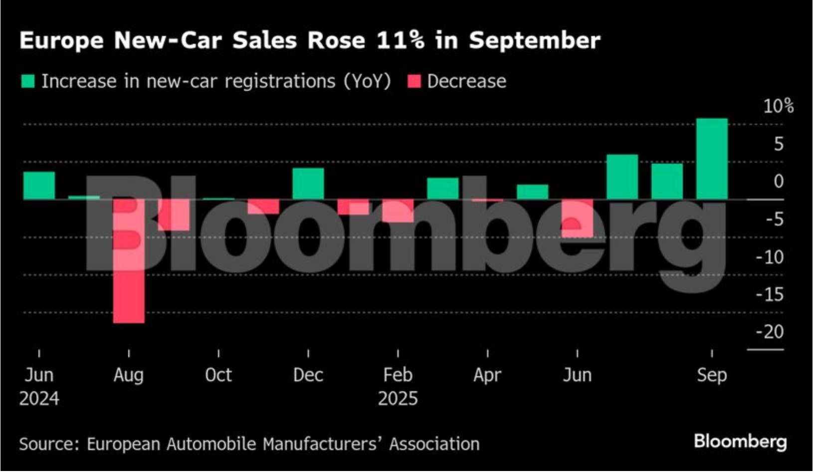Asosiasi Produsen Mobil Eropa (European Automobile Manufacturers’ Association/ACEA) menyebutkan, pendaftaran kendaraan baru naik 11% dibandingkan kinerja tahun sebelumnya yang lemah menjadi 1,24 juta unit. Pengiriman meningkat di lima pasar terbesar kawasan tersebut, dengan Inggris dan Jerman masing-masing mencatat kenaikan 14% dan 13%.