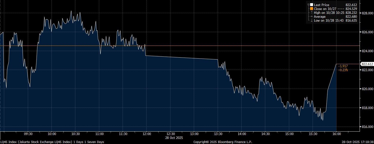 Hingga penutupan perdagangan, indeks LQ45 yang berisikan saham–saham Big Caps tercatat melemah mencapai 0,23% (1,91 poin) ke level 822,61.