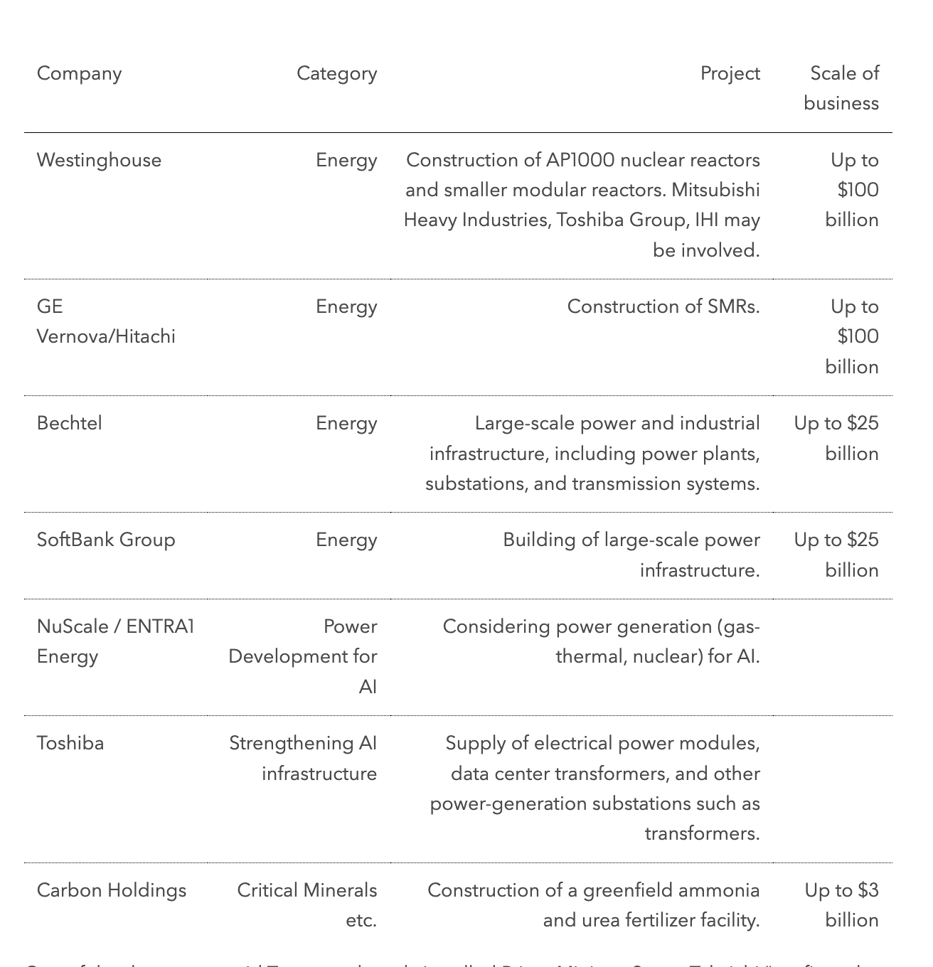 Dalam acara penandatanganan yang digelar Selasa (28/10) di Tokyo, Menteri Perdagangan AS Howard Lutnick memaparkan sejumlah komitmen besar dari korporasi ternama, seperti SoftBank Group, Westinghouse, dan Toshiba Corp. Nilai proyek yang diusulkan berkisar antara US$350 juta hingga US$100 miliar.