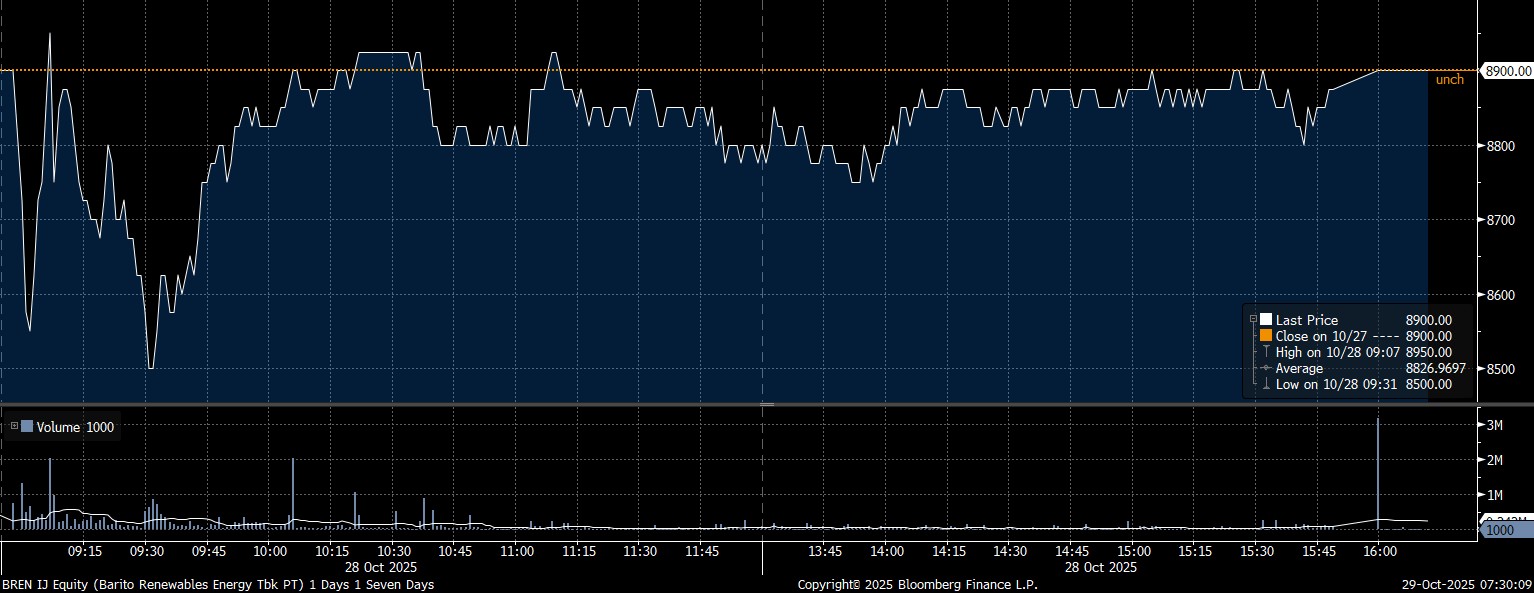 Sedang, investor asing mencatat net buy pada saham PT Barito Renewables Energy Tbk (BREN) mencapai Rp78 miliar. Terdorong manuver pembelian yang deras, saham BREN berhasil bertahan di posisi Rp8.900/saham saat IHSG melemah.