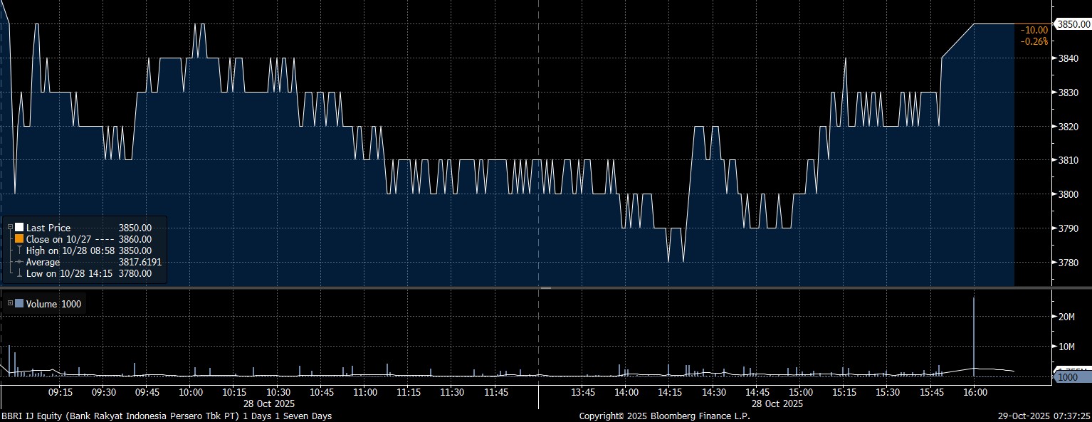 Adapun investor asing net sell yang masif pada saham PT Bank Rakyat Indonesia Tbk (BBRI) mencapai Rp359,89 miliar. Imbas penjualan yang masif, saham BBRI melemah 0,26% di posisi Rp3.850/saham.