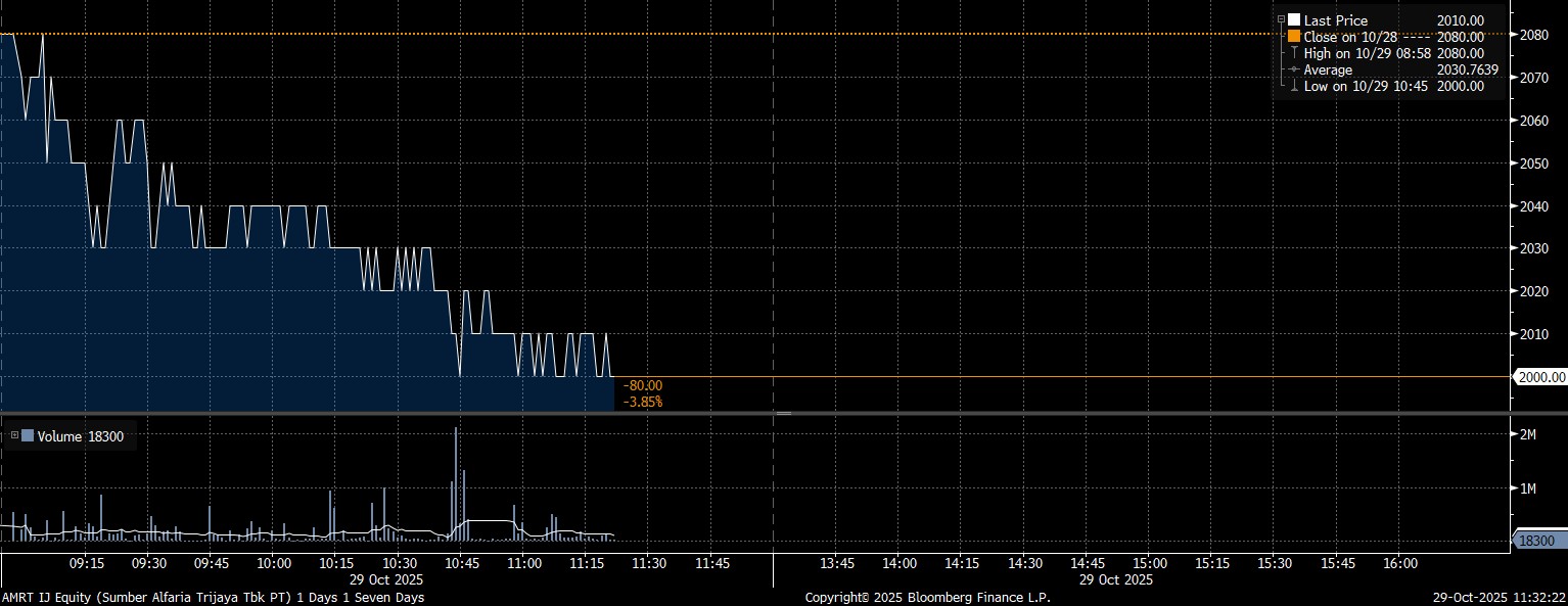 Hingga pukul 11:30 WIB, saham AMRT turun 3,85% atau mencapai 80 poin menjadi Rp2.000/saham.