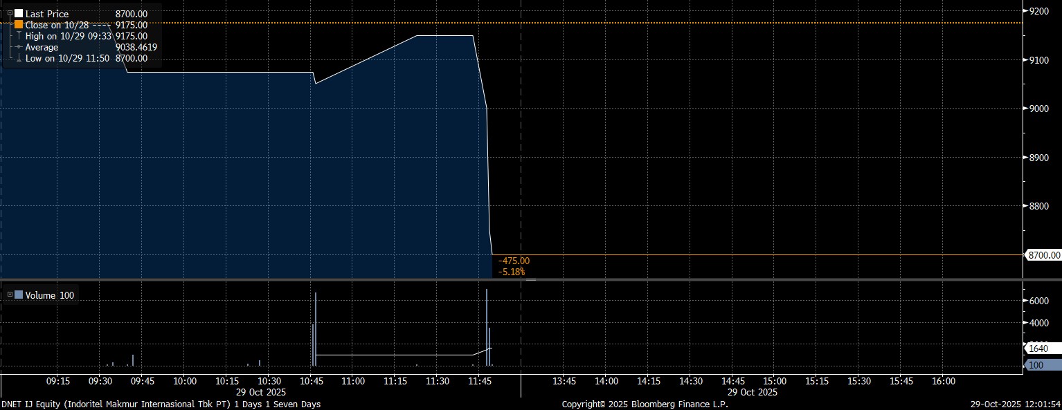 Bloomberg Technoz, Jakarta - Harga saham PT Indoritel Makmur Internasional Tbk (DNET), induk usaha Indomaret, terjatuh amat dalam di zona merah pada perdagangan Sesi I usai disebut-sebut jadi biang keladi dari kemunduran Usaha Mikro Kecil dan Menengah (UMKM).