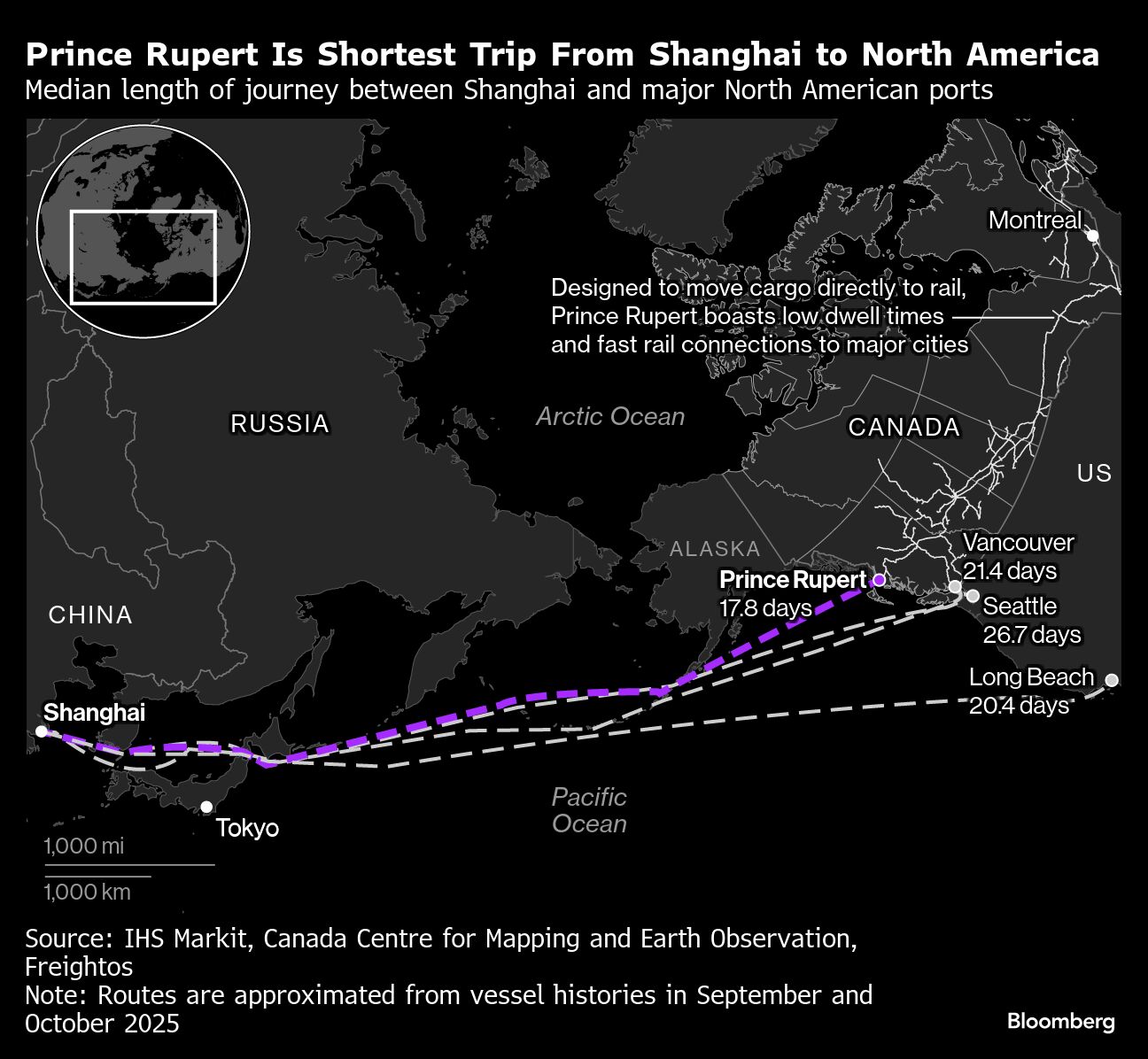 Di British Columbia, Prince Rupert telah menjadi simbol upaya untuk mencari pasar baru bagi produk yang dijual Kanada. Pelabuhan ini selalu disebut oleh politisi yang ribuan mil jauhnya, dari parlemen di Ottawa hingga Saskatchewan, di mana Perdana Menteri Scott Moe menginginkan "koridor" perdagangan utara untuk menjual lebih banyak barang padang rumput ke arah barat.