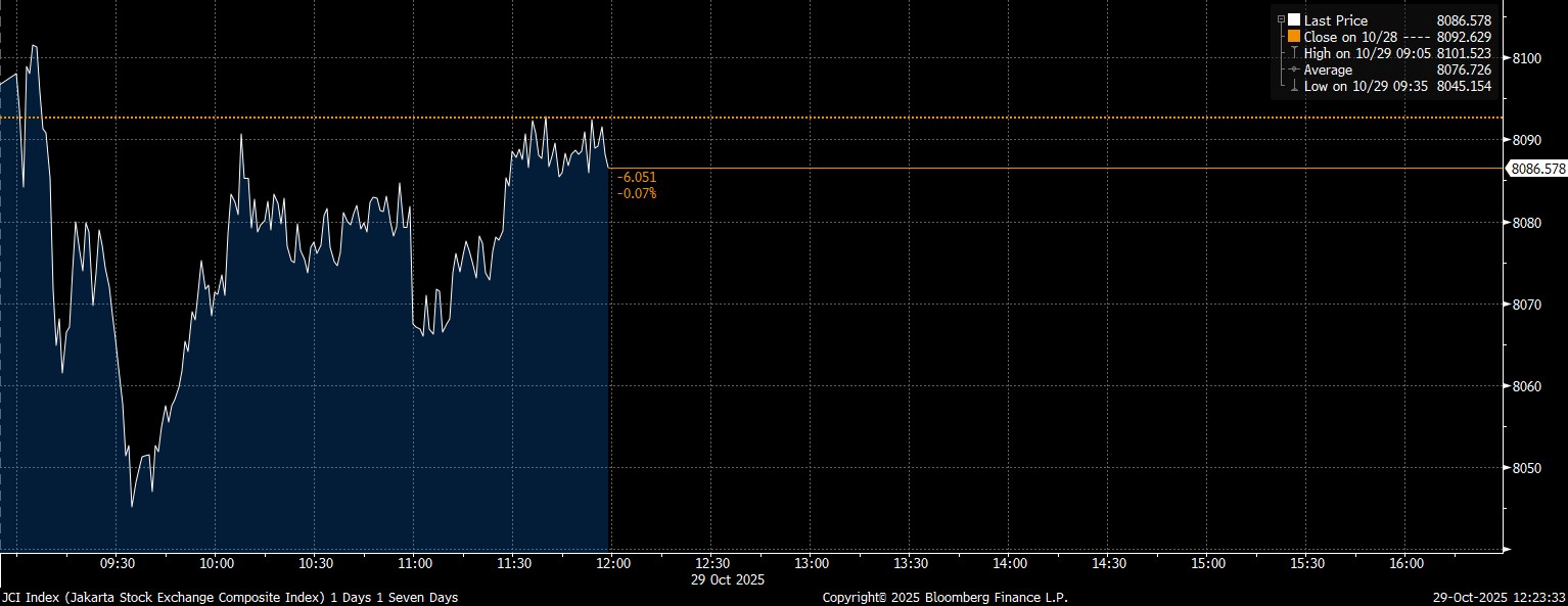 Bloomberg Technoz, Jakarta - Indeks Harga Saham Gabungan (IHSG) ditutup melemah tipis 6 poin (0,07%) di posisi 8.086 pada jeda penutupan Sesi I, Rabu (29/10/2025).