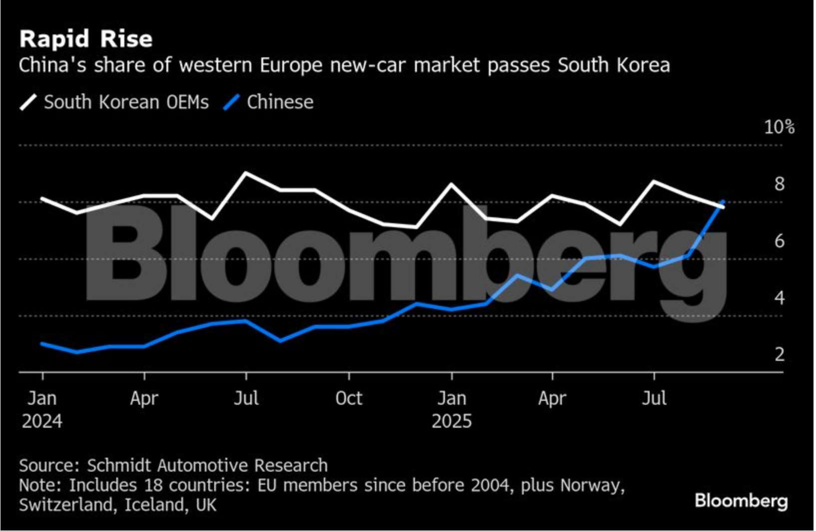 Perusahaan-perusahaan seperti BYD Co., SAIC Motor Corp. (melalui merek MG), dan Chery Automobile Co. menguasai 7,4% dari total penjualan mobil penumpang di Eropa, menurut Dataforce. Untuk pertama kalinya, pangsa pasar ini melampaui produsen Korea Selatan seperti Kia Corp.