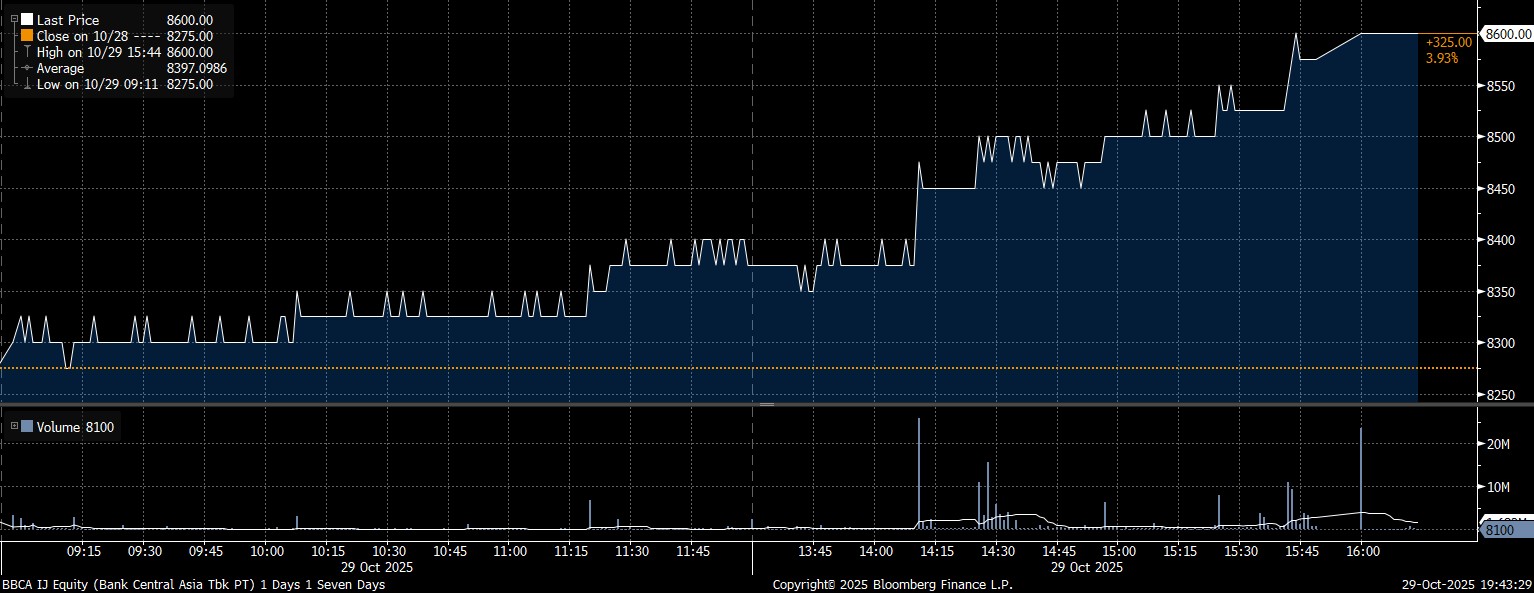 Adapun investor asing mencatat net buy pada saham PT Bank Central Asia Tbk (BBCA) mencapai Rp976,47 miliar. Terpengaruh manuver pembelian yang deras, saham BBCA menguat 3,93% ke posisi Rp8.600/saham.