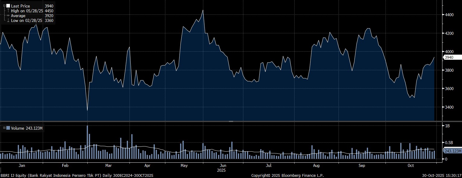 Pada Kamis (30/10/2025) pukul 15:16 WIB, harga saham BBRI berada di Rp 3.934. Naik 1,29% dibandingkan hari sebelumnya.