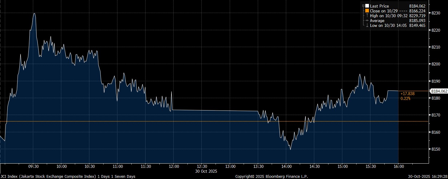 Bloomberg Technoz, Jakarta - Indeks Harga Saham Gabungan (IHSG) berhasil ditutup menguat 0,22% di posisi 8.184 pada perdagangan Kamis (30/10/2025) yang ditopang oleh menguatnya saham Bank Mandiri (BMRI), dan juga saham GOTO.