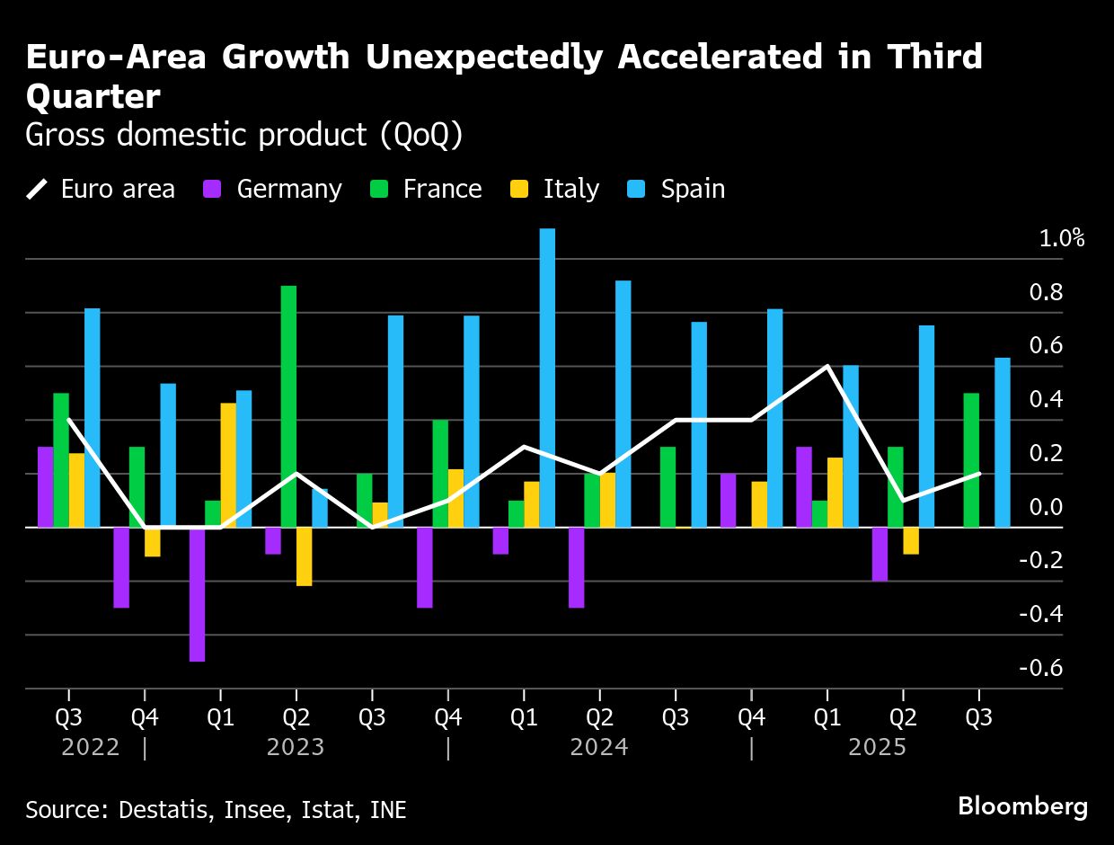 Bloomberg, Ekonomi kawasan euro tumbuh lebih tinggi dari perkiraan, menunjukkan ketahanan terhadap kenaikan tarif impor AS, dengan Prancis mencatat laju pertumbuhan terkuat dalam lebih dari dua tahun terakhir.
