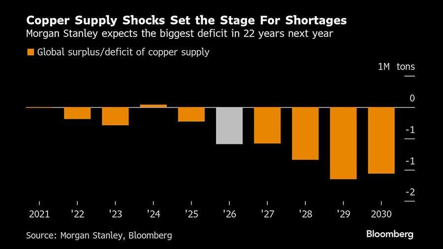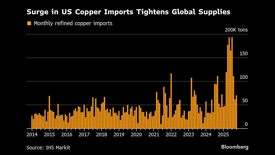 Hal ini menyebabkan tembaga terus mengalir ke AS, memperburuk tekanan pasokan bagi pembeli di tempat lain. Dengan tambang-tambang di seluruh dunia mengalami penurunan produksi dan persediaan tembaga AS yang tertahan, Morgan Stanley memprediksi pasar tembaga global akan menghadapi defisit terparah dalam lebih dari 20 tahun pada 2026.
