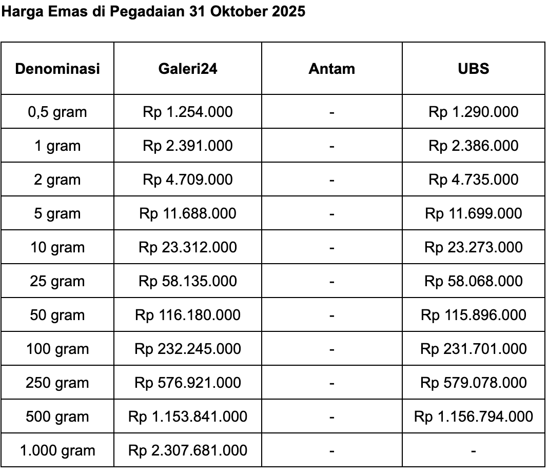 Lalu untuk emas batangan Galeri 24 ukuran 0,5 gram, Pegadaian menjual di harga Rp 1.254.000. Berkurang Rp 1.000 ketimbang harga kemarin.