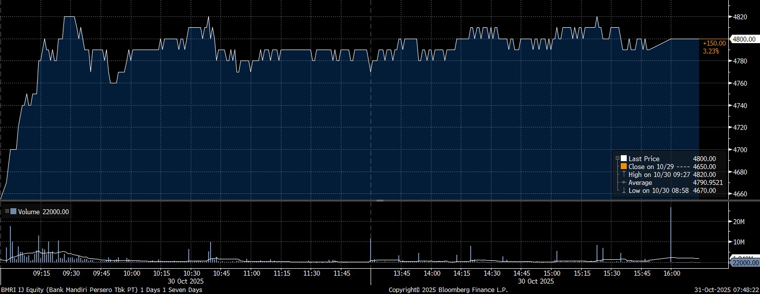 Adapun investor asing mencatat net buy pada saham PT Bank Mandiri Tbk (BMRI) mencapai Rp649,25 miliar. Terdorong manuver pembelian, saham BMRI menguat 3,23% melesat ke posisi Rp4.800/saham.
