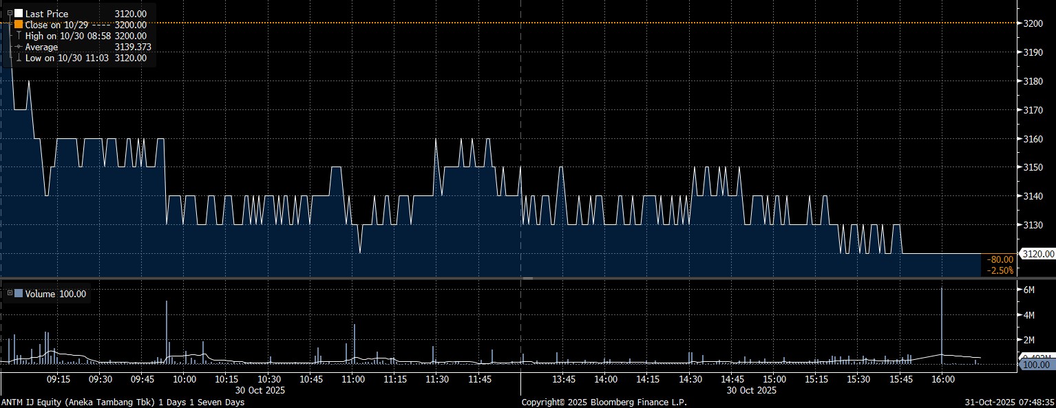 Sedang, investor asing net sell yang masif pada saham PT Aneka Tambang Tbk (ANTM) mencapai Rp91,4 miliar. Imbas penjualan yang masif, saham ANTM melemah 2,51% di posisi Rp3.120/saham.