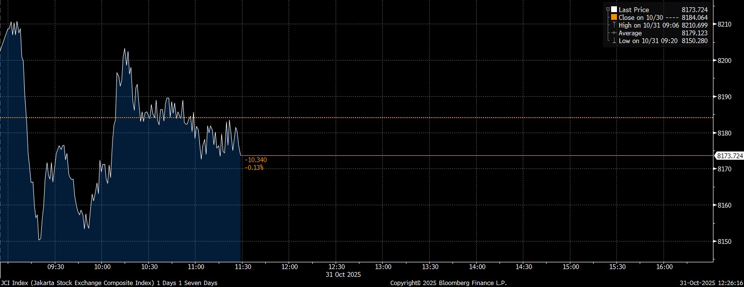 Bloomberg Technoz, Jakarta - Indeks Harga Saham Gabungan (IHSG) balik arah hingga menutup perdagangan Sesi I di zona merah dengan pelemahan 0,13% dan kehilangan 10,34 poin di posisi 8.173,72 pada perdagangan Jumat (31/10/2025).