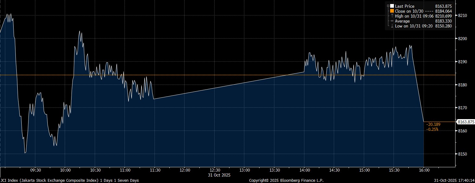 Bloomberg Technoz, Jakarta - Indeks Harga Saham Gabungan (IHSG) menutup perdagangan hari ini, Jumat (31/10/2025), di zona merah. IHSG melemah 20,18 poin atau drop 0,25% ke level 8.163,87.
