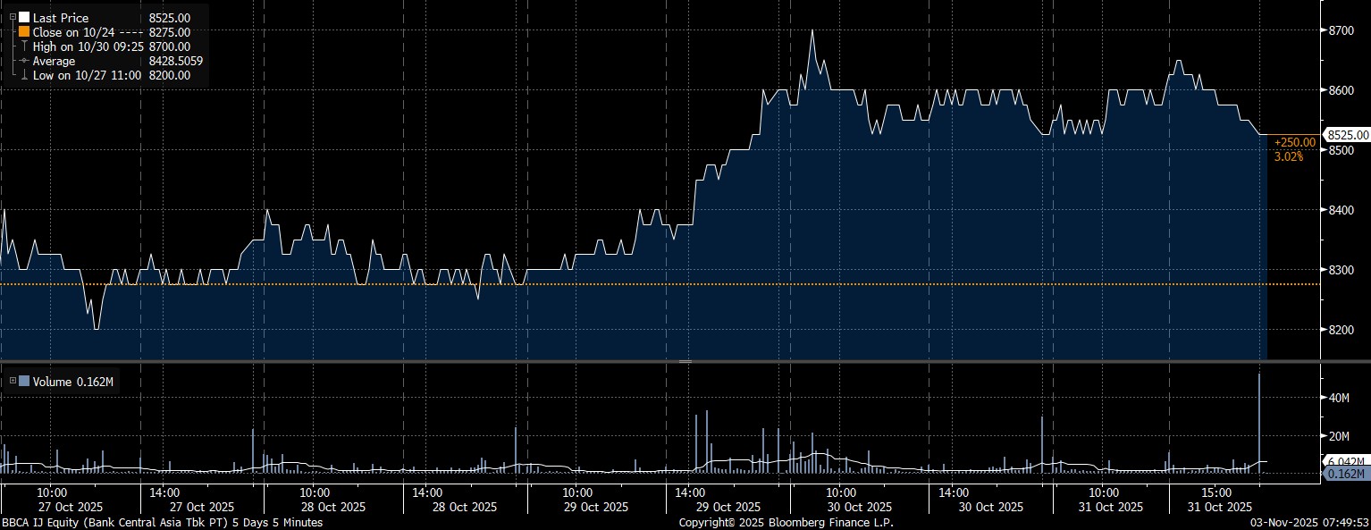 Adapun investor asing tercatat net buy saham terbanyak pada emiten PT Bank Central Asia Tbk (BBCA) mencapai Rp1,6 triliun. Sejalan dengan tren pembelian, saham BBCA menguat 3% dalam seminggu ke posisi Rp8.525/saham.