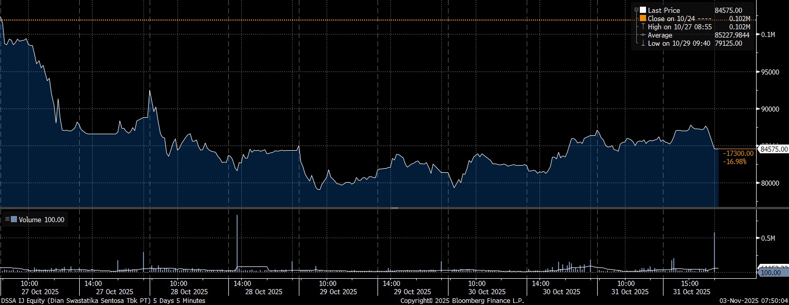 Pada kesempatan yang sama, investor asing mencatat net sell tertinggi pada saham PT Dian Swastatika Sentosa Tbk (DSSA) mencapai Rp200 miliar. Imbas tekanan jual yang amat masif, saham DSSA ambles 16,98% mencapai posisi Rp84.575/saham.
