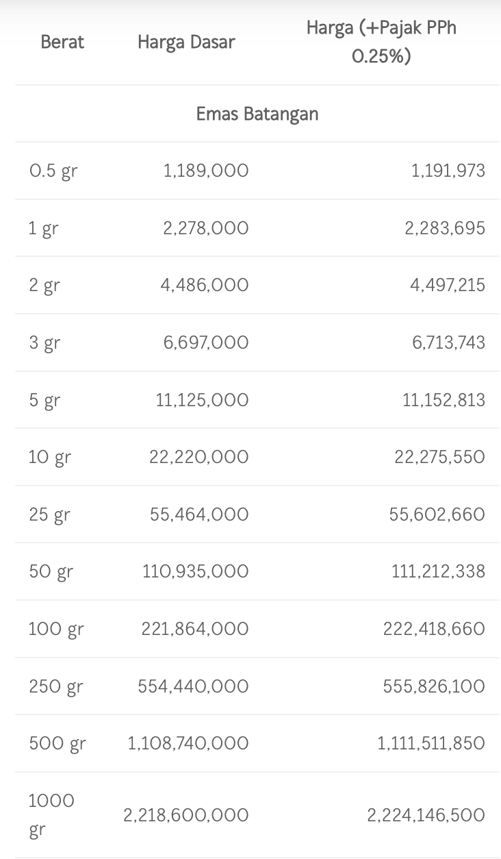 Berikut daftar harga emas Logam Mulia Antam selengkapnya hari ini: