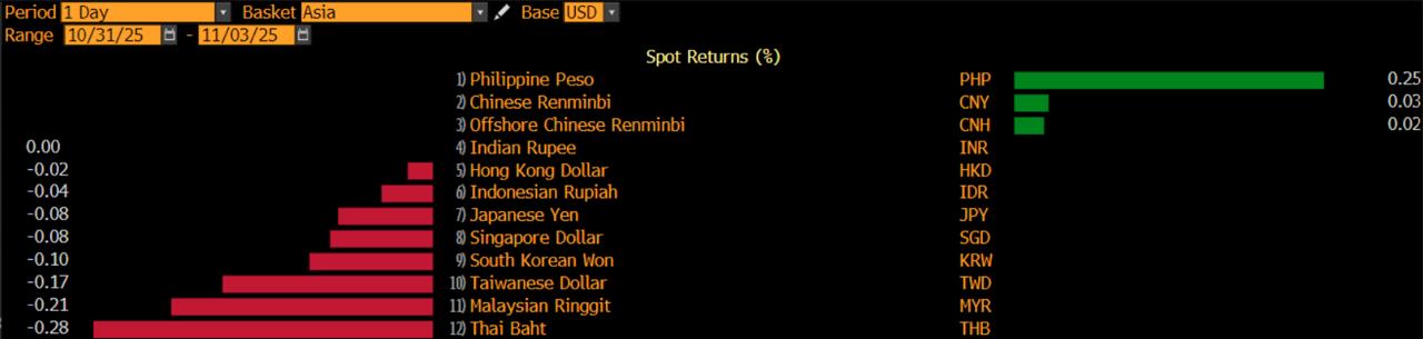 Sejauh ini hanya tiga mata uang yang bisa bertahan di zona hijau. Mereka ada adalah peso Filipina yang menguat 0,25%, yuan China dengan apresiasi 0,03%, dan yuan offshore yang menghijau 0,02%.