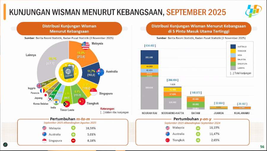 Dari sisi asal wisatawan, Malaysia menjadi penyumbang terbesar dengan porsi 19,5%, disusul Australia (11,7%) dan Singapura (8,5%). BPS mencatat, dibandingkan Agustus 2025, kunjungan dari Malaysia dan Australia meningkat, sementara dari Singapura mengalami penurunan.