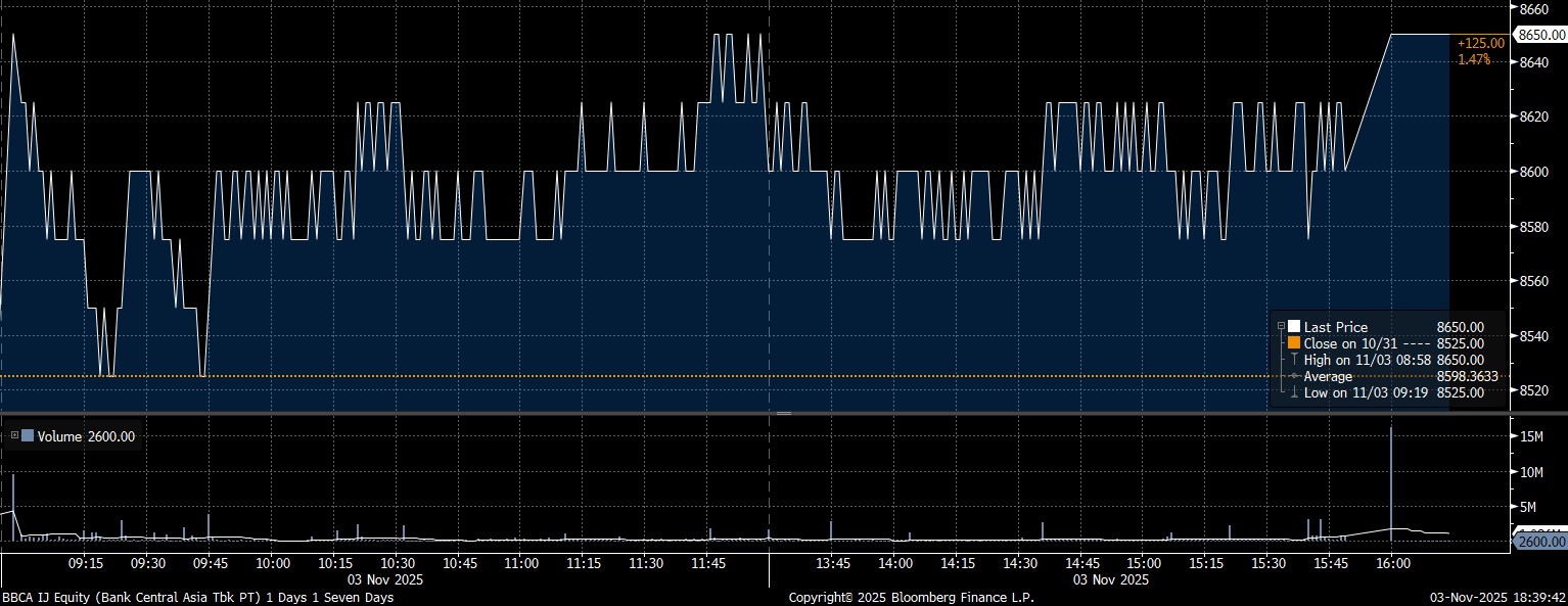 Adapun investor asing mencatat net buy pada saham PT Bank Central Asia Tbk (BBCA) mencapai Rp398,61 miliar. Terdorong manuver pembelian, saham BBCA menguat 1,47% melesat ke posisi Rp8.650/saham.
