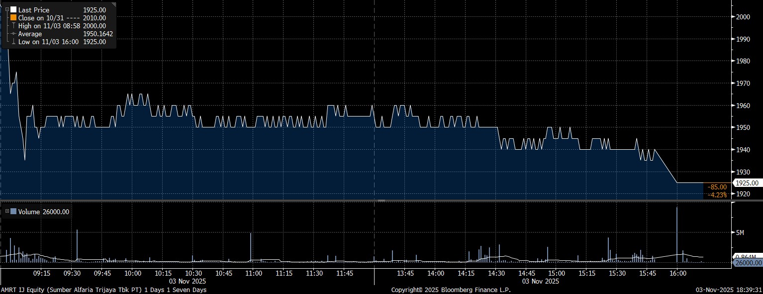 Sedang, investor asing net sell yang masif pada saham PT Sumber Alfaria Trijaya Tbk (AMRT) mencapai Rp75,83 miliar. Imbas penjualan yang masif, saham AMRT melemah 4,23% di posisi Rp1.925/saham.