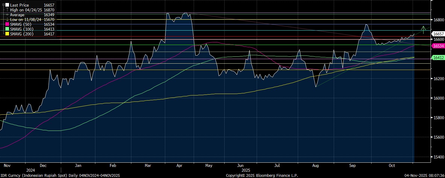 Sementara trendline terdekat pada time frame daily menjadi resistance potensial di level Rp16.640/US$. Kemudian, target penguatan optimis lanjutan untuk dapat kembali menguat ke level Rp16.600/US$.