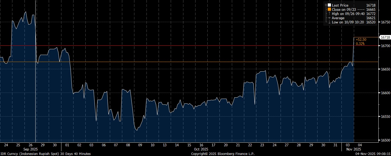 Pada Selasa (4/11/2025), US$ diperdagangkan Rp 16.679 kala pembukaan pasar spot. Mata uang Tanah Air terdepresiasi 0,13% dibandingkan penutupan kemarin.