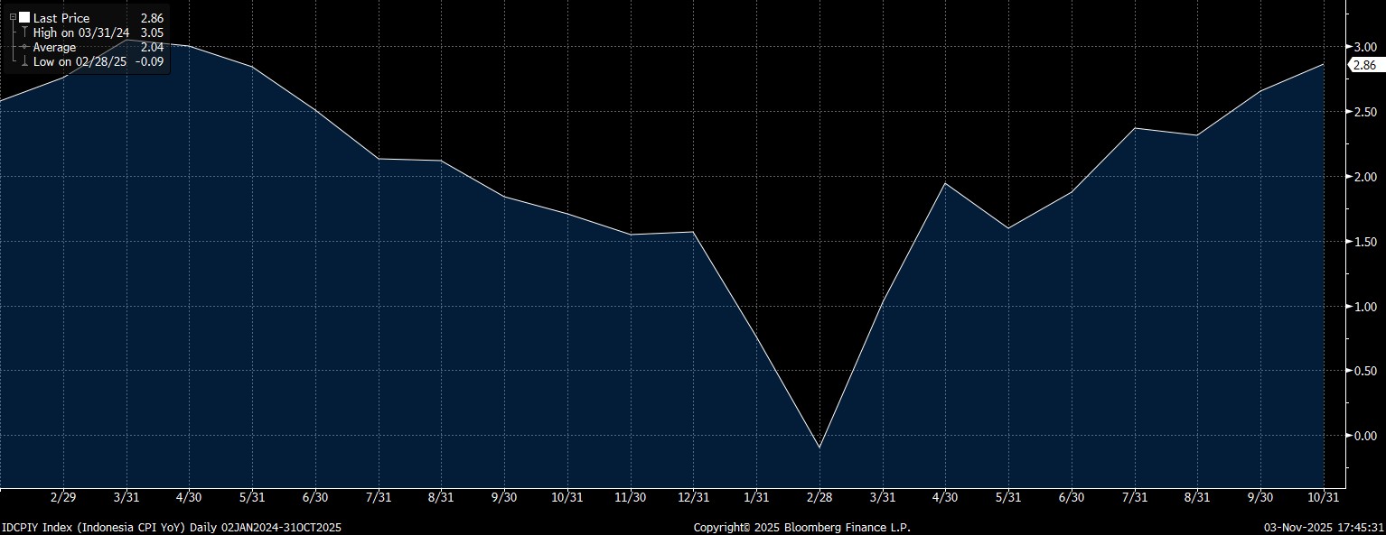 Untuk November 2025, sejumlah sentimen dan katalis berpotensi memengaruhi IHSG selama satu bulan ke depan terutama rilisnya data inflasi Indonesia. BPS melaporkan, Indeks Harga Konsumen (IHK) pada Oktober 2025 mengalami inflasi yang terakselerasi 2,86% atau tertinggi sejak April 2024, lebih tinggi juga dibanding penilaian konsensus pasar yang dihimpun Bloomberg sebesar 2,64%.