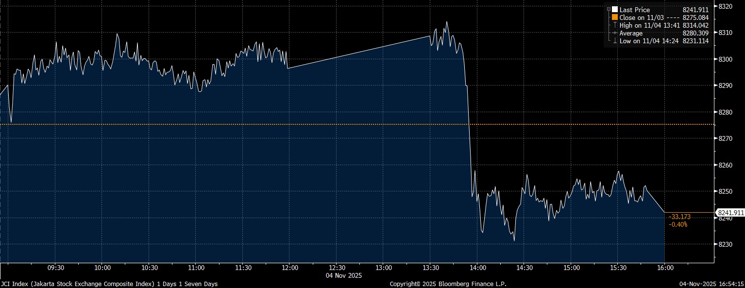 Bloomberg Technoz, Jakarta - Indeks Harga Saham Gabungan (IHSG) balik arah jadi melemah 0,4% di posisi 8.241 pada penutupan perdagangan Selasa (4/11/2025), usai rupiah melemah tajam di level Rp16.700/US$, setelah sempat menyentuh level terendah Rp16.733/US$ pagi hari tadi.