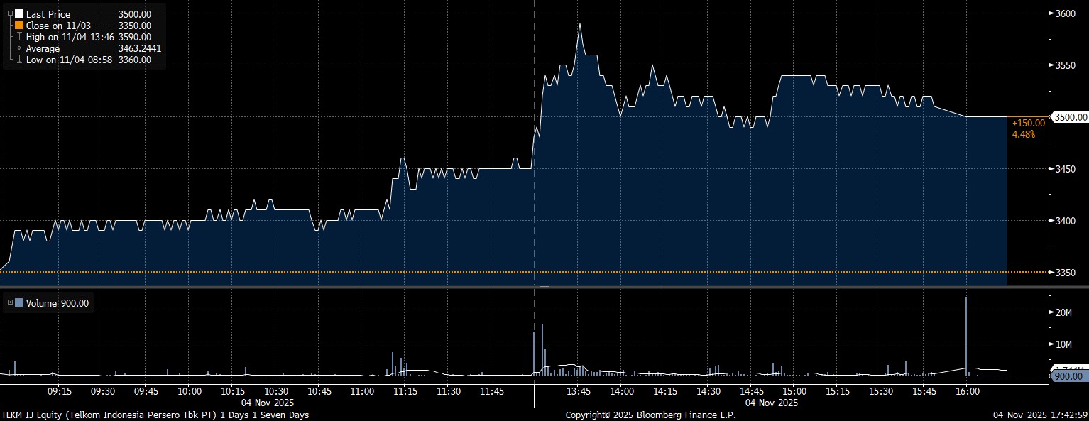Adapun investor asing mencatat net buy pada saham PT Telkom Indonesia Tbk (TLKM) mencapai Rp369,27 miliar. Terdorong manuver pembelian, saham TLKM menguat 4,48% melesat ke posisi Rp3.500/saham.