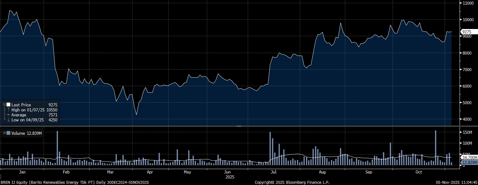 Dalam dua hari ini saja, Senin–Selasa (3–4 November), nilai beli bersih investor asing (net buy) atas saham BREN mencapai Rp140,8 miliar. Posisi ini menjadikan saham BREN sebagai salah satu saham dengan net buy terbesar.