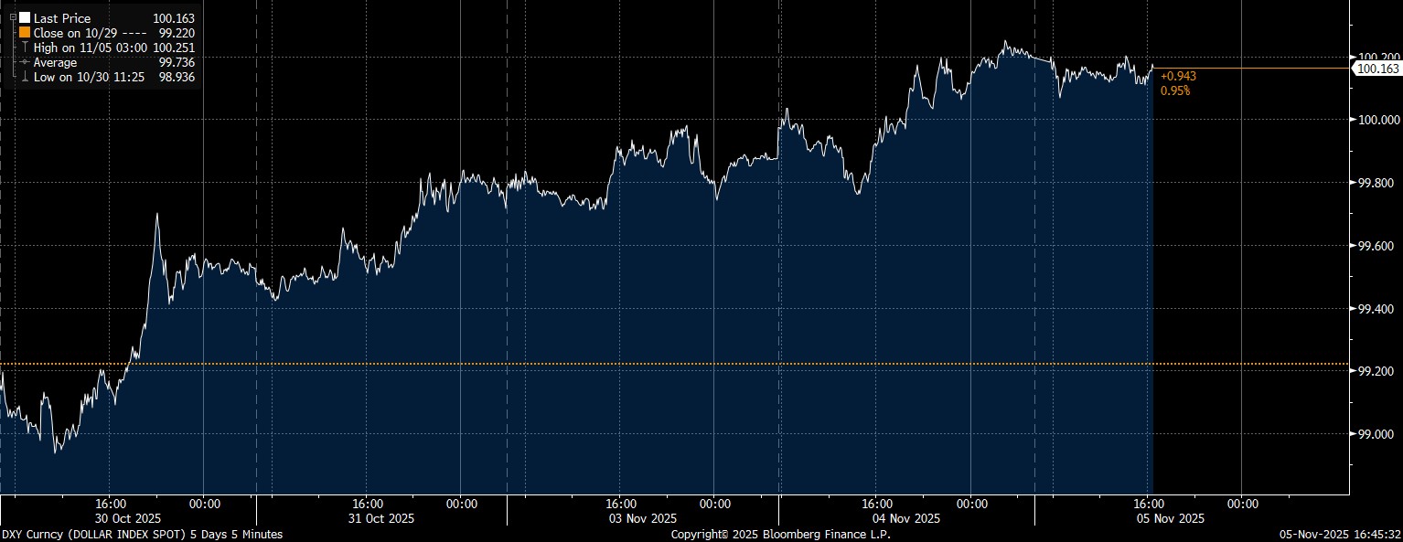 DXY menguat ke level tertingginya sejak Mei, sekaligus menandai kenaikan hari kelima berturut–turut, hingga siang hari ini, dolar AS masih 'ganas' di zona harga tertinggi 100,168.