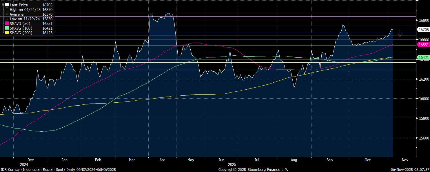 Pada Rabu (5/11/2025), US$1 setara dengan Rp16.705 kala penutupan perdagangan pasar spot. Rupiah terdepresiasi 0,03% dibanding hari sebelumnya.