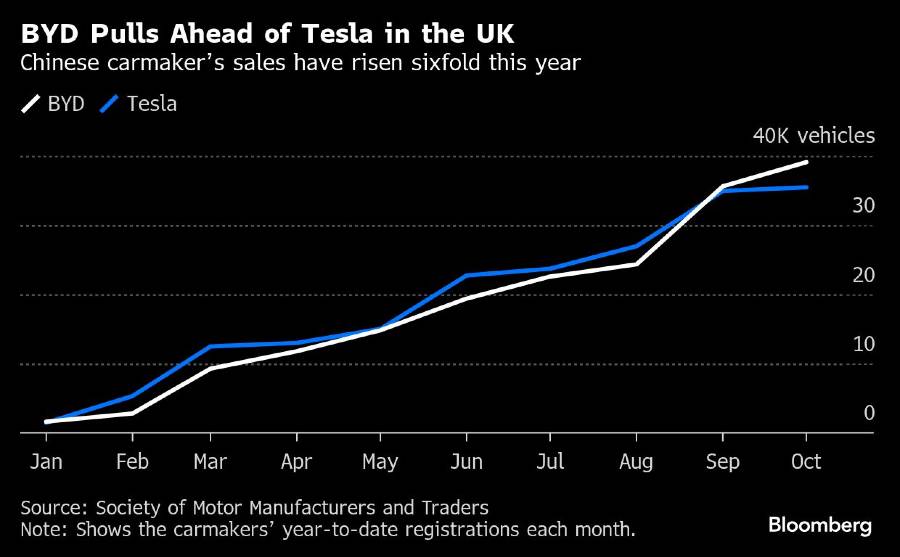 Kenaikan BYD sangat pesat di kedua pasar tersebut. Perusahaan hanya mencatatkan 8.788 unit mobil tahun lalu di Inggris, menyalip Jerman sebagai pasar terbesar mobil listrik plug-in di Eropa. Tesla mengalahkan perusahaan tersebut dengan selisih penjualan hampir 6 banding 1.
