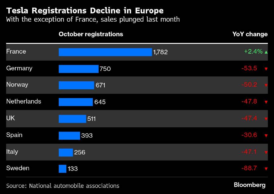 Sebaliknya, Tesla mengalami pelemahan di seluruh Eropa akibat persaingan yang semakin ketat dan reaksi negatif terhadap Musk. Pendaftaran kendaraan baru perusahaan ini anjlok 54% bulan lalu dan turun setengahnya sepanjang tahun ini di Jerman.