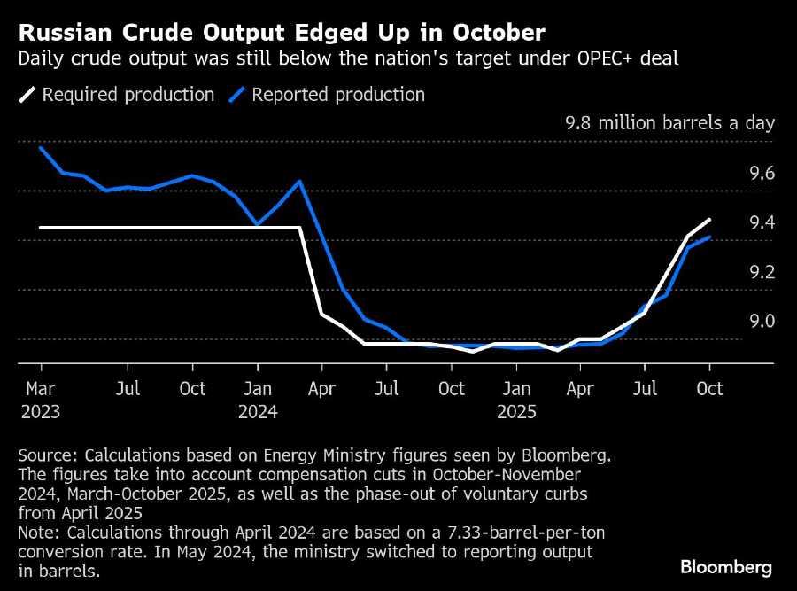 Bloomberg, Produksi minyak mentah Rusia sedikit meningkat pada Oktober, tetapi masih di bawah kuota OPEC+ akibat meningkatnya tekanan internasional terhadap sektor energi negara tersebut.