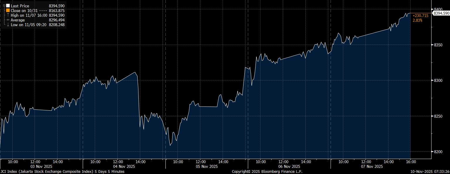 Bloomberg Technoz, Jakarta - Indeks Harga Saham Gabungan (IHSG) ditutup di zona hijau pada perdagangan sepekan hingga Jumat (7/11/2025). IHSG menguat 2,83% ke posisi 8.394,59.