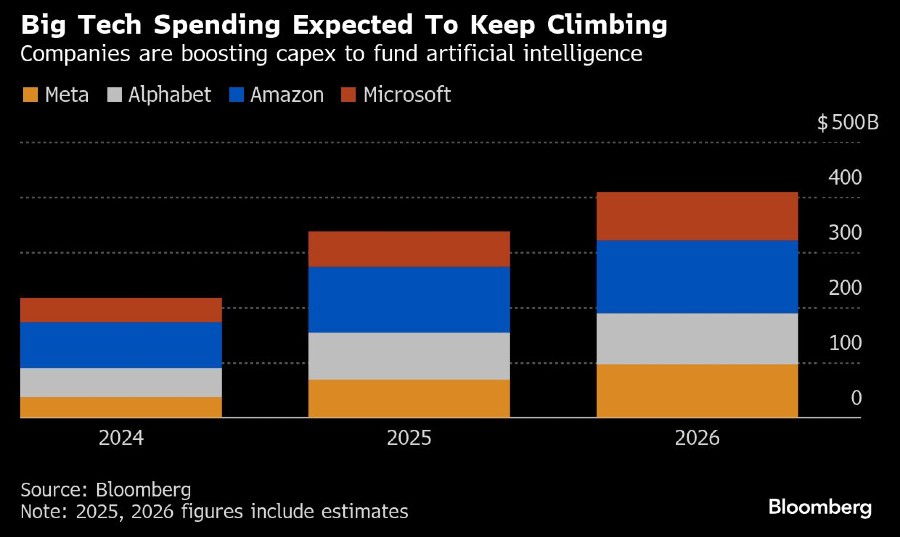 Meta Platforms Inc., Alphabet Inc., Amazon.com Inc., dan Microsoft Corp. akan menghabiskan lebih dari US$400 miliar untuk mendanai pengembangan kecerdasan buatan tahun depan, naik 21% dari 2025, untuk memastikan kepemimpinan dalam perlombaan teknologi emerging.