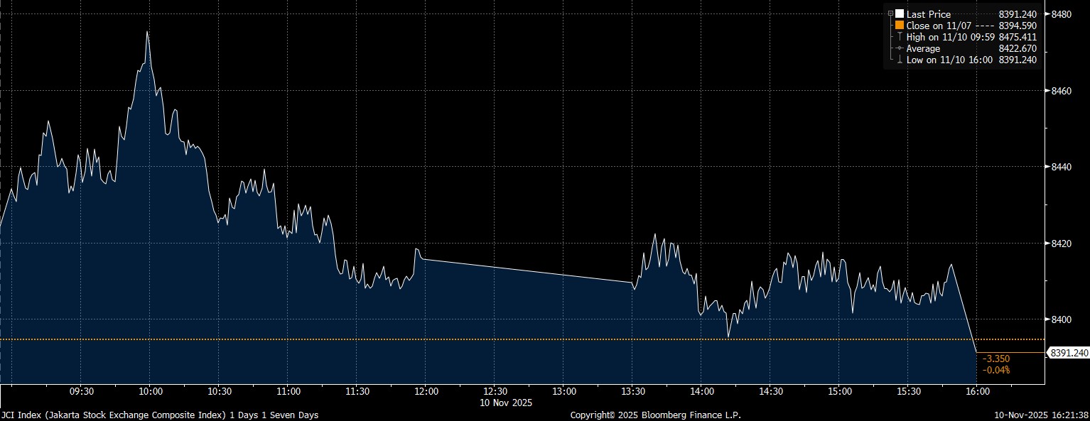 Bloomberg Technoz, Jakarta - Balik arah saat penutupan perdagangan, Indeks Harga Saham Gabungan (IHSG) menutup perdagangan hari ini, Senin (10/11/2025), di zona merah. IHSG melemah 3,35 poin (0,04%) ke 8.391,24.