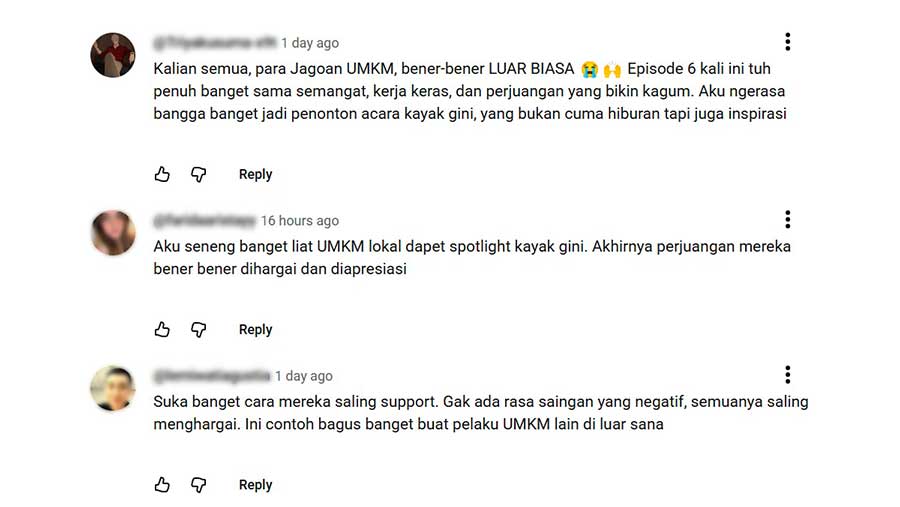 Banyak penonton mengaku terinspirasi oleh semangat dan keteguhan para pengusaha UMKM yang menghadirkan kisah perjuangan nyata penuh emosi dan motivasi, terlihat dari kolom komentar YouTube Shopee Indonesia yang dipenuhi ungkapan dukungan dan apresiasi dari netizen. Setiap tayangan tidak hanya memancing decak kagum, tetapi juga membangkitkan rasa bangga terhadap kreativitas dan daya juang anak bangsa yang berani berinovasi dan terus berusaha untuk naik kelas.