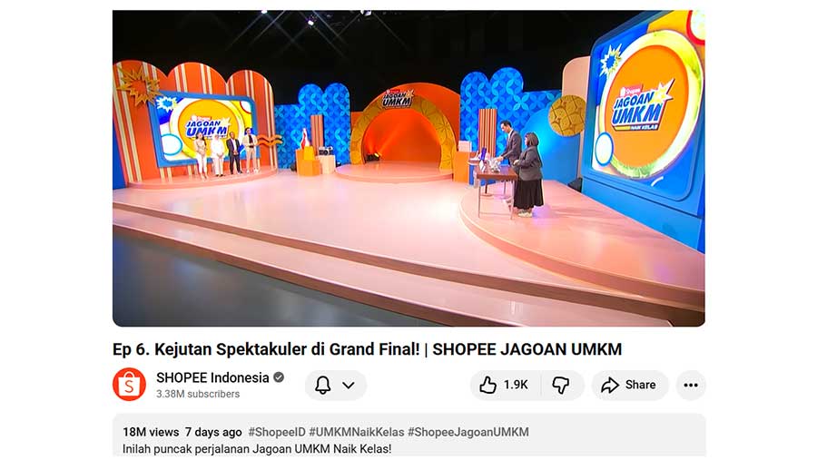 Bloomberg Technoz, Jakarta - Shopee Jagoan UMKM Naik Kelas, reality show UMKM perdana yang hadir dalam format web series di YouTube Shopee Indonesia, menutup enam episodenya dengan respon yang positif dari publik. Sejak penayangan perdananya, program ini langsung menarik perhatian publik berkat perpaduan kisah inspiratif, drama kompetisi bisnis, dan pesan pemberdayaan yang kuat. Hingga akhir penayangan, program ini berhasil mencatat lebih dari 85 juta views serta lebih dari 25 ribu likes dan komentar di YouTube Shopee Indonesia. Hasil ini menjadikan Shopee Jagoan UMKM Naik Kelas sebagai salah satu web series lokal yang menarik perhatian dan diterima di hati masyarakat.