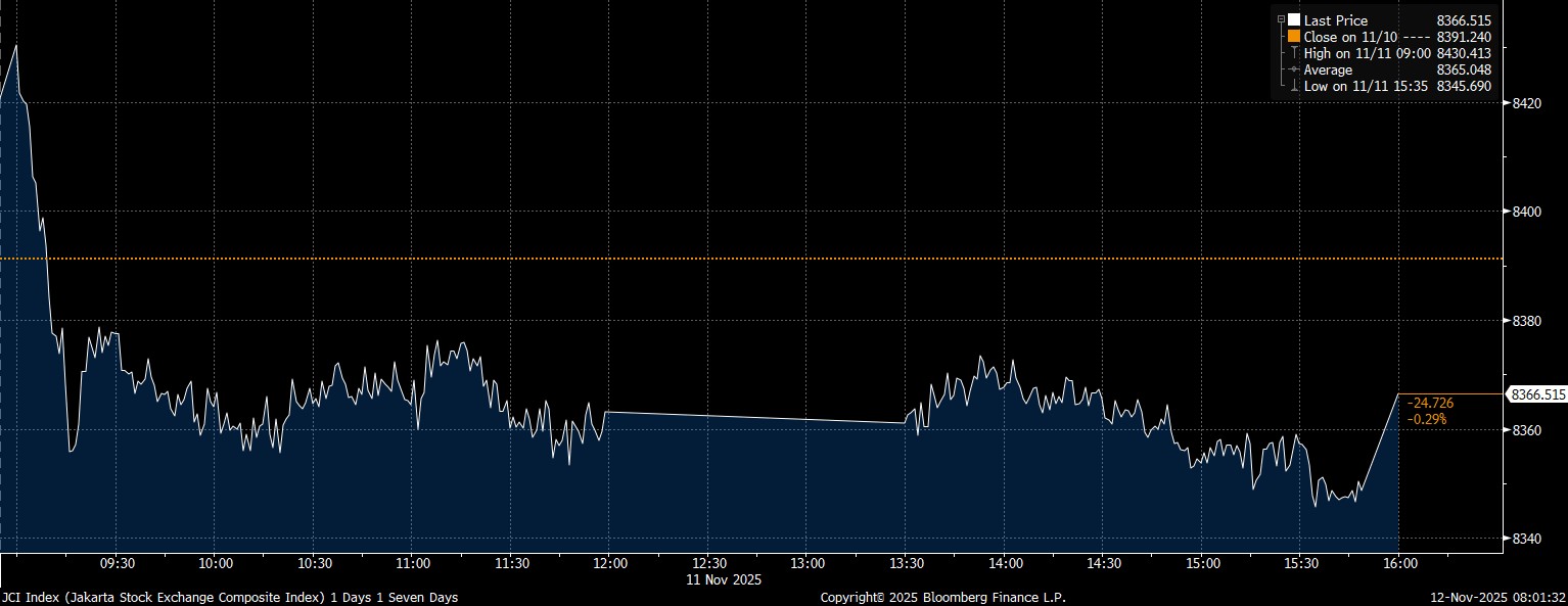 Bloomberg Technoz, Jakarta - Indeks Harga Saham Gabungan (IHSG) pada perdagangan kemarin, Selasa (11/11/2025), ditutup di zona merah. IHSG melemah 0,29% dan terpeleset di posisi 8.366,51.
