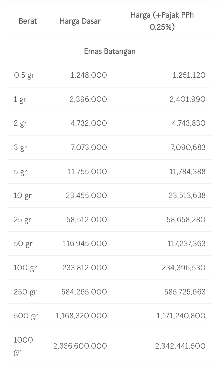 Berikut daftar lengkap harga emas Logam Mulia Antam untuk hari ini:
