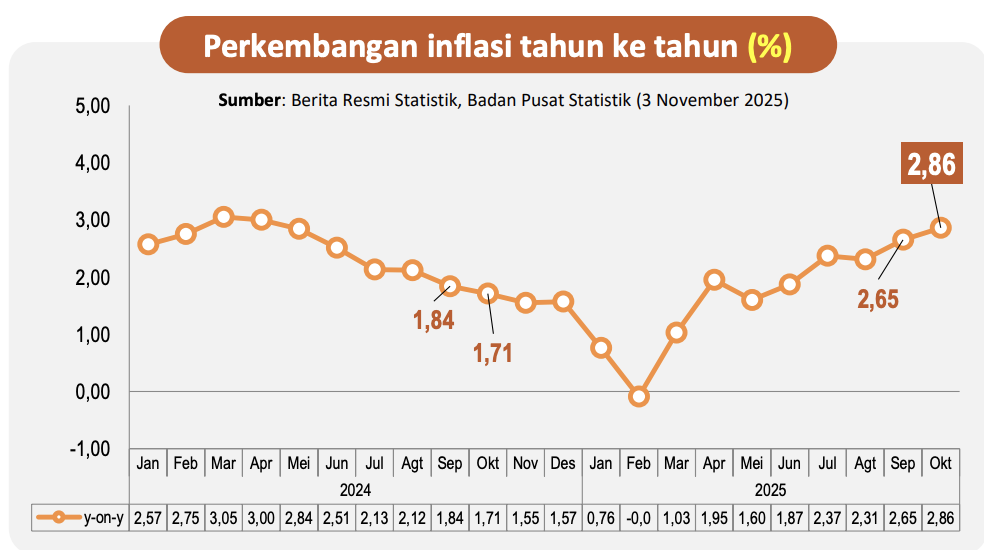 Badan Pusat Statistik (BPS) melaporkan, inflasi pada Oktober tercatat 2,86% year-on-year (yoy). Ini menjadi yang tertinggi sejak April tahun lalu.