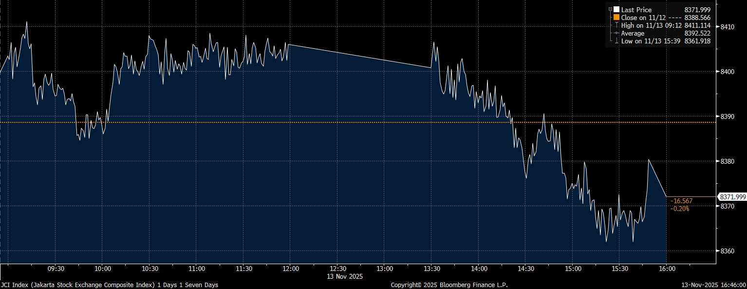 Berseberangan jauh dengan Bursa Asia, IHSG justru ditutup melemah 0,2% atau kehilangan 16,56 poin ke posisi 8.371,99 pada perdagangan Kamis (13/11/2025).