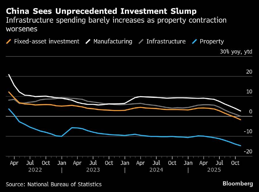 Bloomberg, Aktivitas ekonomi China pada awal kuartal IV-2025 melambat lebih dari perkiraan. Penurunan investasi yang belum pernah terjadi sebelumnya dan melambatnya pertumbuhan produksi industri semakin membebani konsumsi yang lesu.