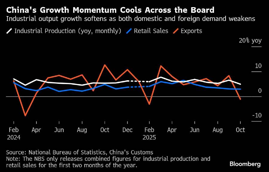 Ekonomi terbesar kedua di dunia ini semakin kehilangan momentum pada awal kuartal terakhir setelah pertumbuhan melambat selama enam bulan sebelumnya. China lebih rentan setelah ekspor secara tak terduga berkontraksi, yang jika berlanjut, akan membuatnya lebih rawan pada perlambatan belanja konsumen di dalam negeri.