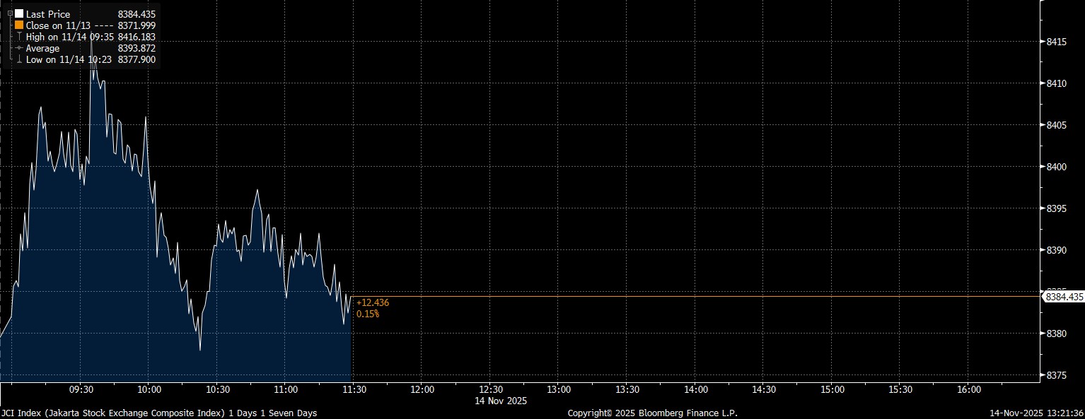 Bloomberg Technoz, Jakarta - Indeks Harga Saham Gabungan (IHSG) berhasil bertahan di zona positif pada perdagangan Sesi I dengan penguatan 0,15% ke 8.384,43 pada Jumat (14/11/2025).